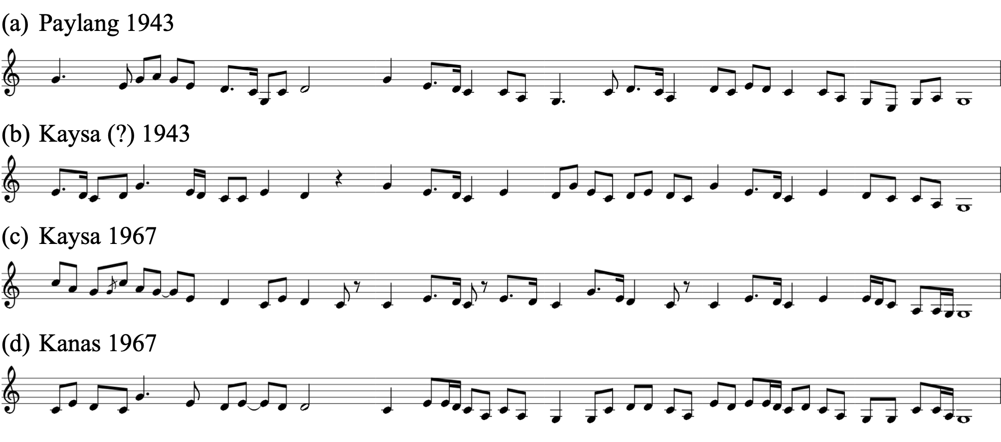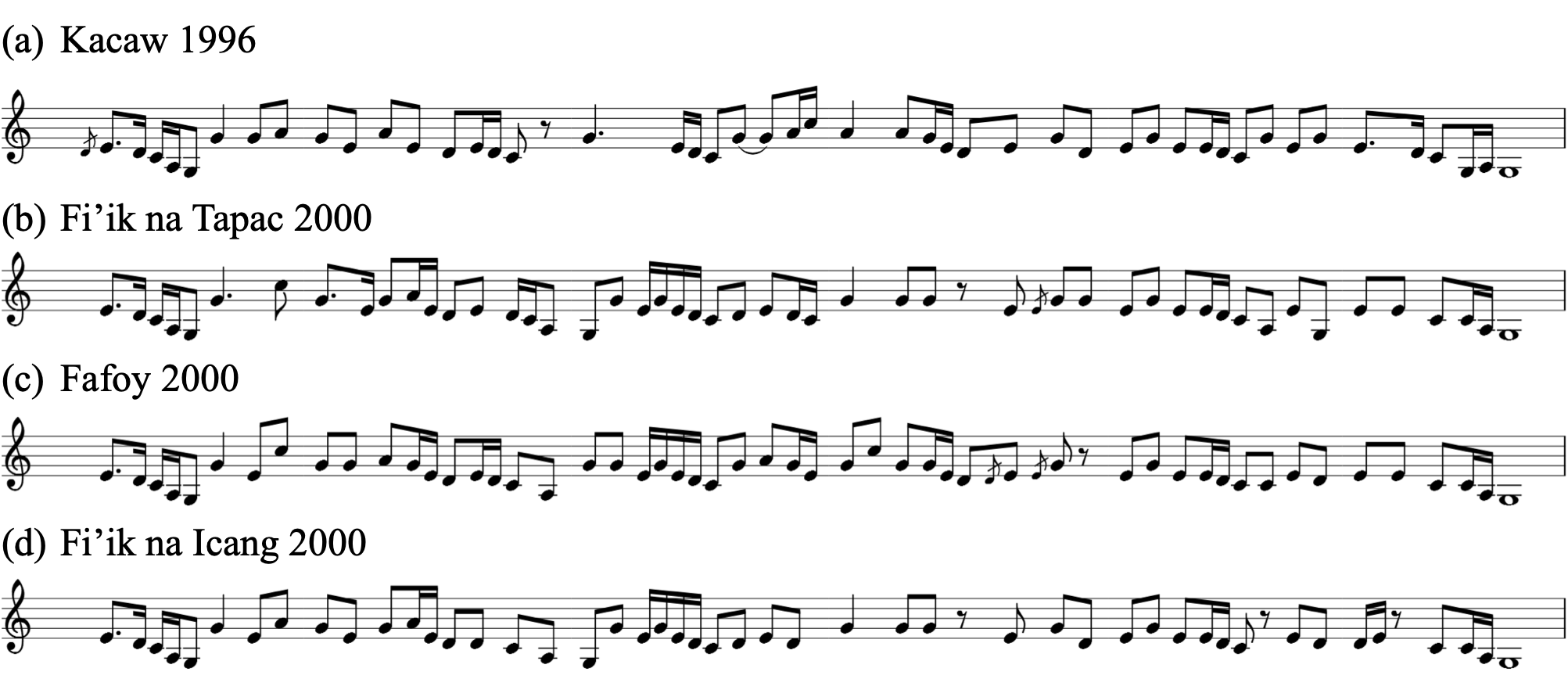 音樂出處:(a) 與 (b) 取自【黑澤隆朝】 CD2 之 31,錄於 1943 年;(c) 與 (d) 取自【呂炳川唱片】 8,呂炳川錄於 1967 年。
