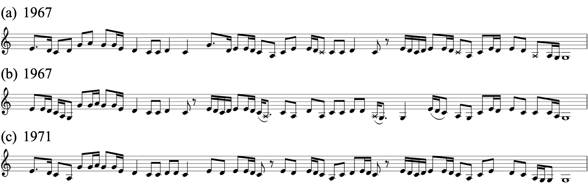 這兩句話可視為馬蘭人對於「彎曲」的操作型定義,在此定義下,並沒有特別提到樂句開頭該怎麼唱,只須樂句的結尾相同即可,亦即結束在同音上。譜例 18(a) 中老一輩演唱〈第二首長歌〉開頭的種種變化唱法,不啻為明證。那麼實際演唱時何以判斷是什麼歌曲以適時接唱,靠的就是歌手彼此之間的瞭解。播放 1943 年調查團採錄的〈第二首長歌〉給現在的馬蘭人聽,他們往往無法第一時間就辨別出歌曲,而是要聽到旋律中段才能確定甚至樂句結尾才能確定,原因就在於他們不熟悉早期的唱法,需要更多旋律上的特徵才得以辨認。現在的馬蘭人唱歌時往往同一首歌的開頭演唱相同旋律,而且每一次演唱的開頭差不多都一樣,如譜例 18(c) 一般,這是演唱技巧不如以往造成的結果,久而久之變成現在的演唱習慣。