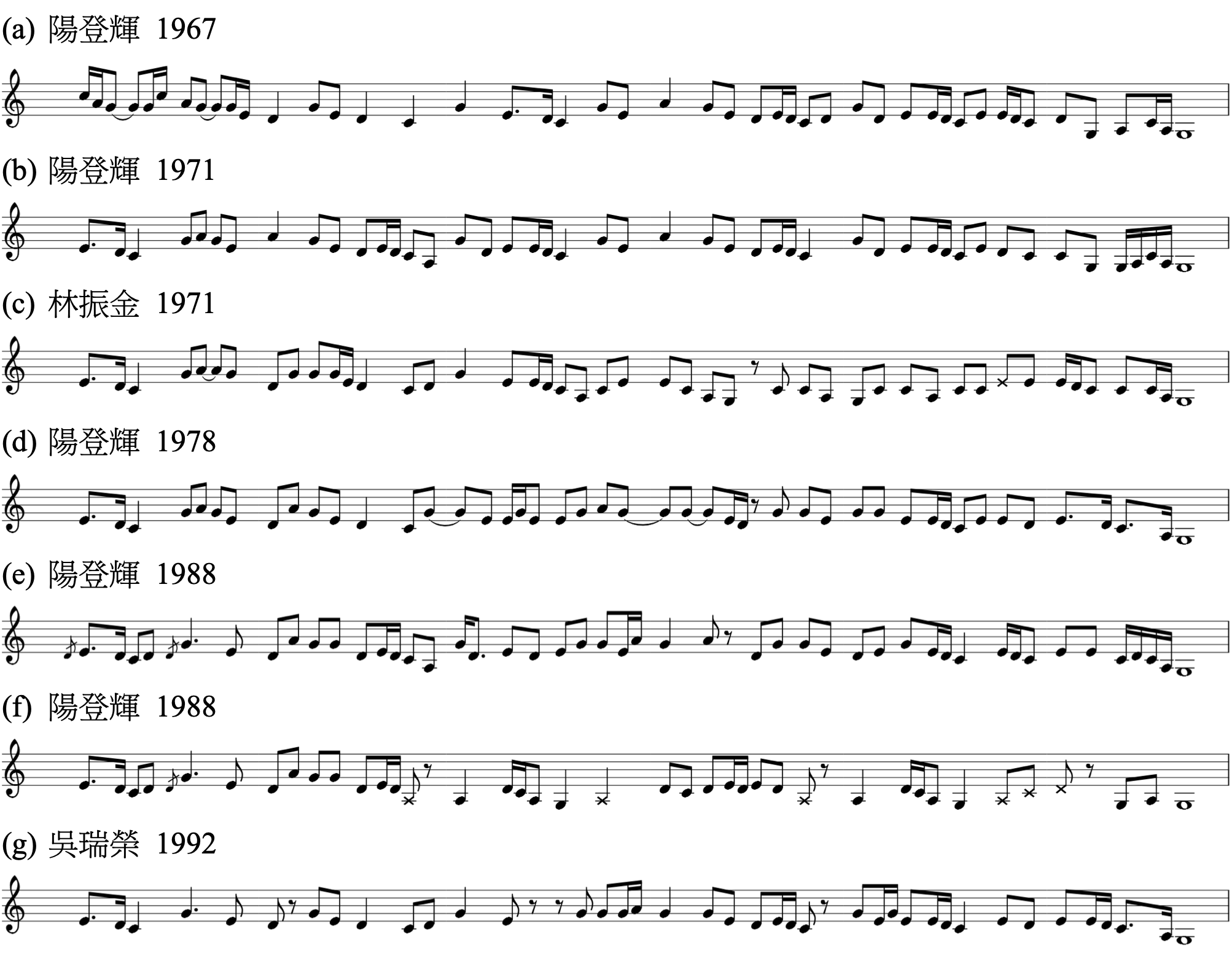 音樂出處:(a)【許常惠還原】 ADR-005A-02;(b) 與 (c)【呂炳川】 102A 之 2,姬野翠錄於 1971 年;(d)【第一】 2,許常惠錄於 1978 年;(e) 黃貴潮之私人錄音,1988 年;(f)【法國】 4,Pierre Simonin 錄於 1988 年;【吳榮順】 2,錄於 1992 年。