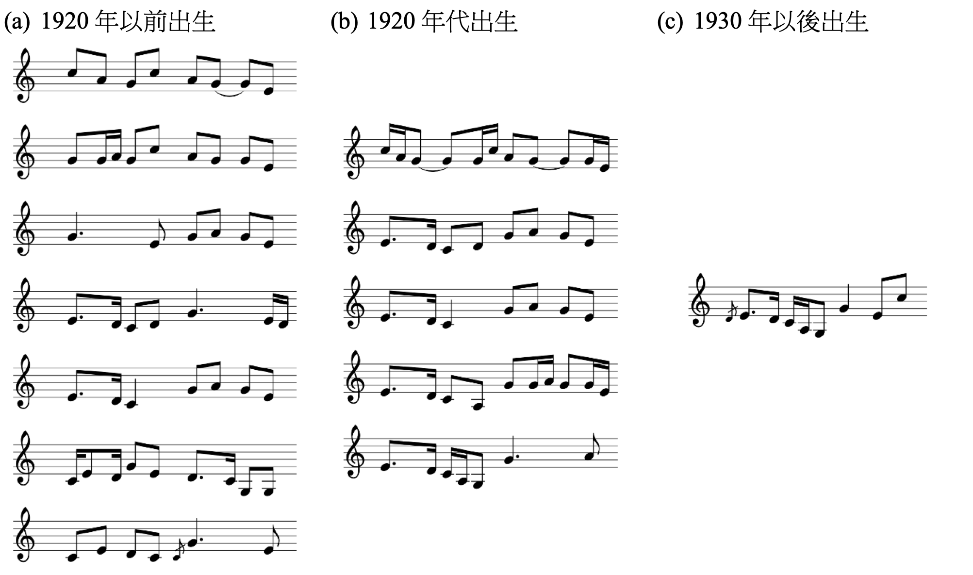 由於歷來有大量的〈第二首長歌〉錄音,時間橫跨了七十年,演唱者眾多,又來自不同的年齡層,因此若要根據錄音所呈現的多樣旋律形態來探究「彎曲」的技巧,不得不考慮錄音的採錄時間,以及歌唱者世代的問題。接下來的討論就要從這兩個層面切入,具體的觀察對象仍是〈第二首長歌〉的第二樂句。
