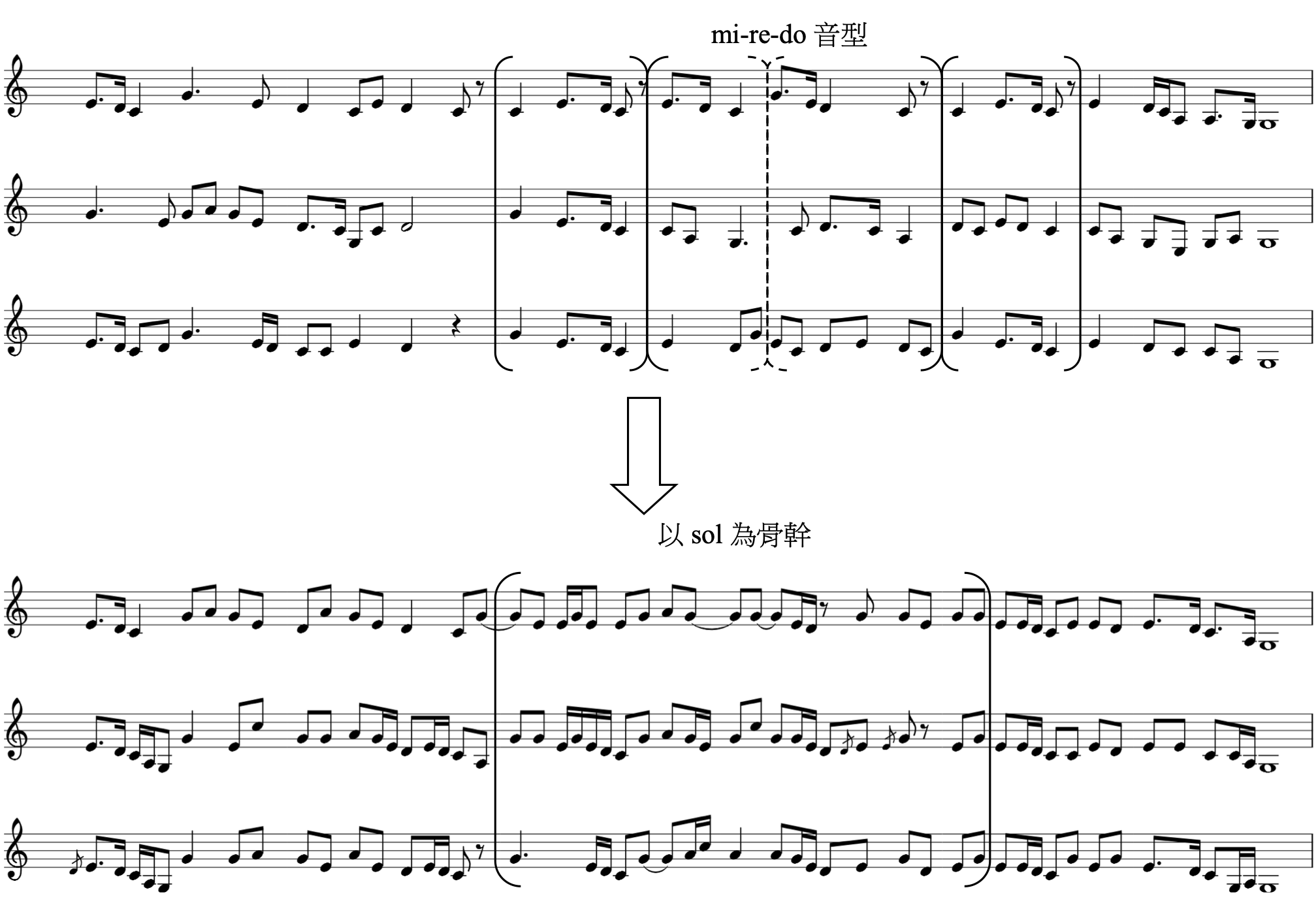就以〈第二首長歌〉的第二樂句為例,在樂句的中段部分,早期錄音顯示老一輩歌手常反覆使用 mi-re-do 的音型;但是到了晚近的錄音包括現在馬蘭人的演唱,這個段落變成以 sol 音為主幹,並在其附近圍繞(譜例 19)。