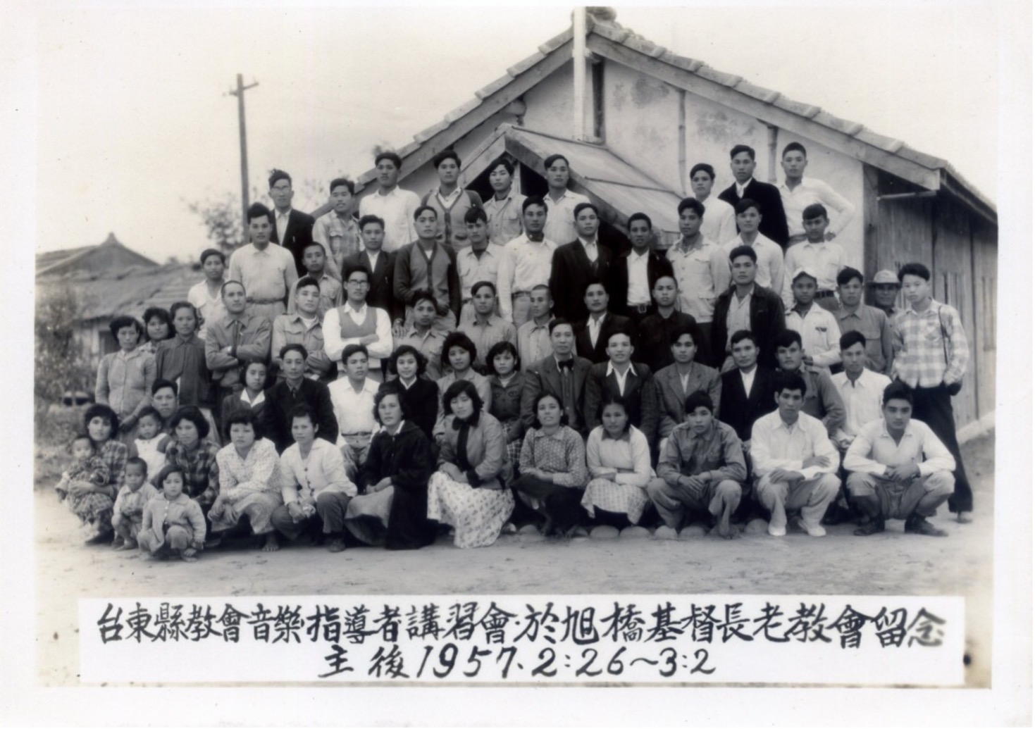 早期信徒能夠自行聚會練唱聖詩,主要是其中有羅櫻花這類音樂能力突出的教友,特別受過西方樂理及教會音樂的訓練,成為眾信徒的種子音樂教師。訓練的機制稱為「音樂指導者講習會」,一張珍貴的照片記錄了 1957 年 2 至 3 月間,駱先春牧師在旭橋教會(即當時的豐里教會之別名)擔任當地阿美族教友之音樂指導者講習會講師(圖 48)。至於 1965 年鈴鈴唱片錄音中彈奏風琴者,據目前的馬但教會教友報導,是一位名叫 Iku 的婦女,她曾前往位於花蓮的「基督教芥菜種會」7 1954 年由長老教會牧師孫雅各(James Dickson)之妻孫理蓮(Lillian Dickson)創立,參見李貞德 2004 。學習,因而成為幼稚園老師,她的風琴演奏能力就是在芥菜種會習得的。