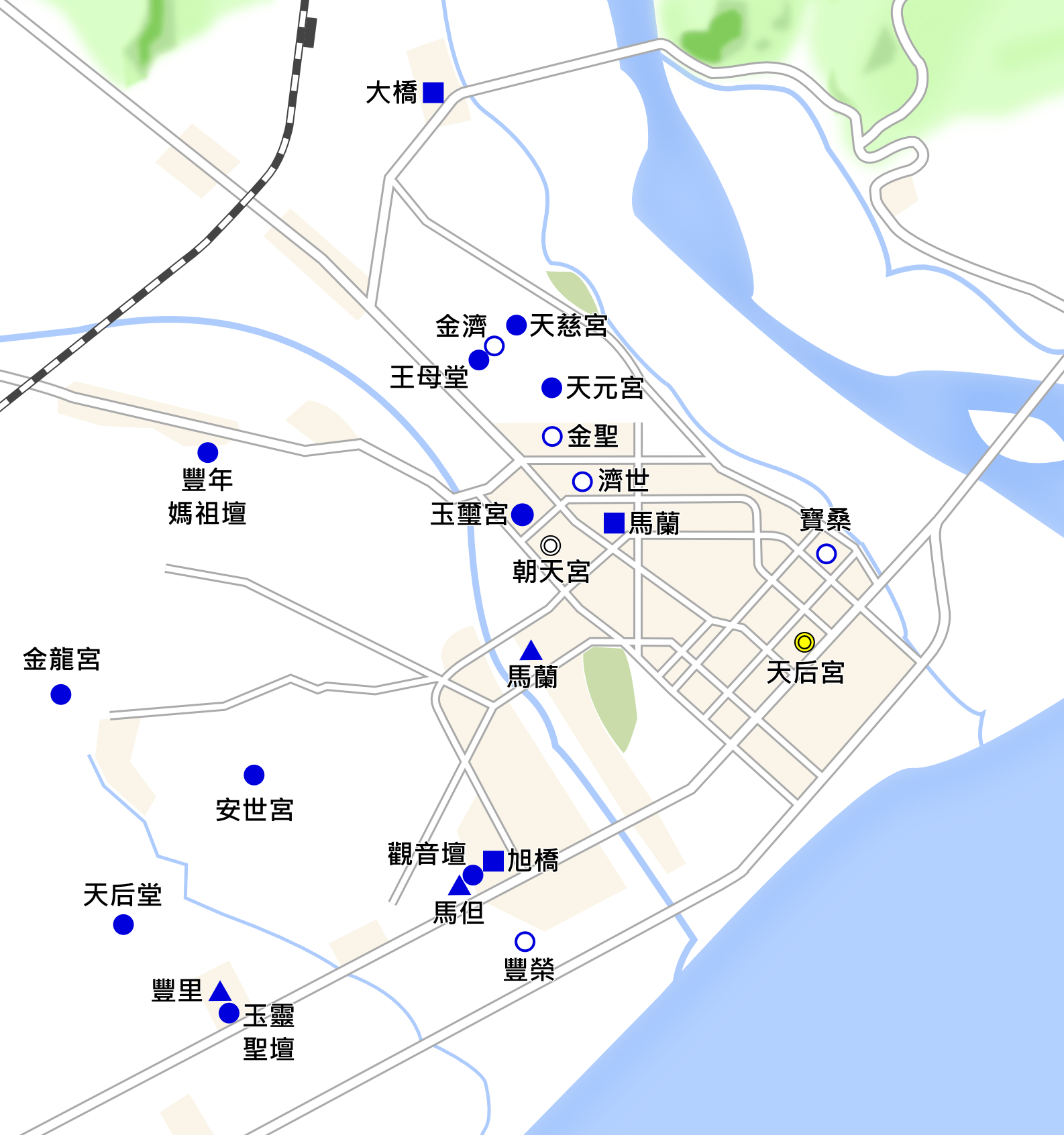 說明:除臺東天后宮及馬蘭朝天宮外(標◎符號),僅標記馬蘭阿美人較主要的宗教場所。○符號表示慈惠堂;●表其他漢式宮廟神壇;▲表長老教會;■表天主堂。慈惠堂、長老教會及天主堂只標記其名,例如:■標「馬蘭」者為「馬蘭天主堂」;▲標「馬但」者為「基督長老教會馬但教會」。資料來源:筆者訪查;林素珍等 2008 。筆者繪圖。